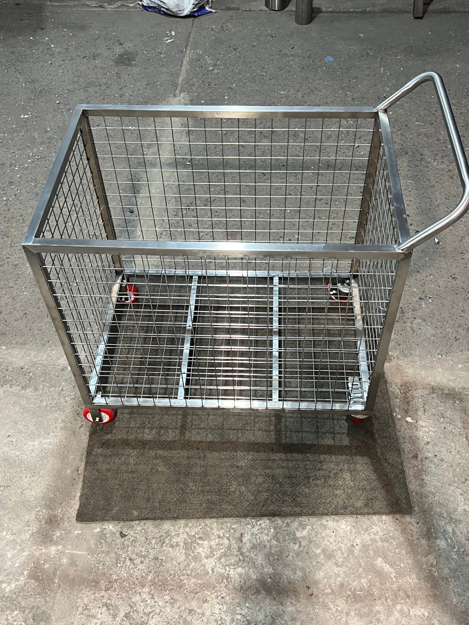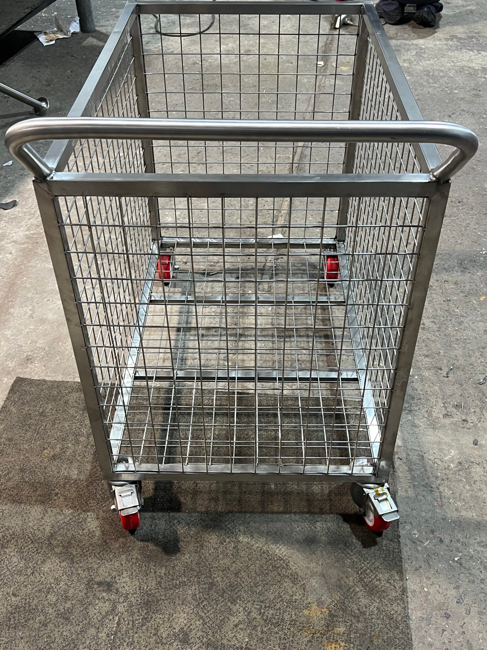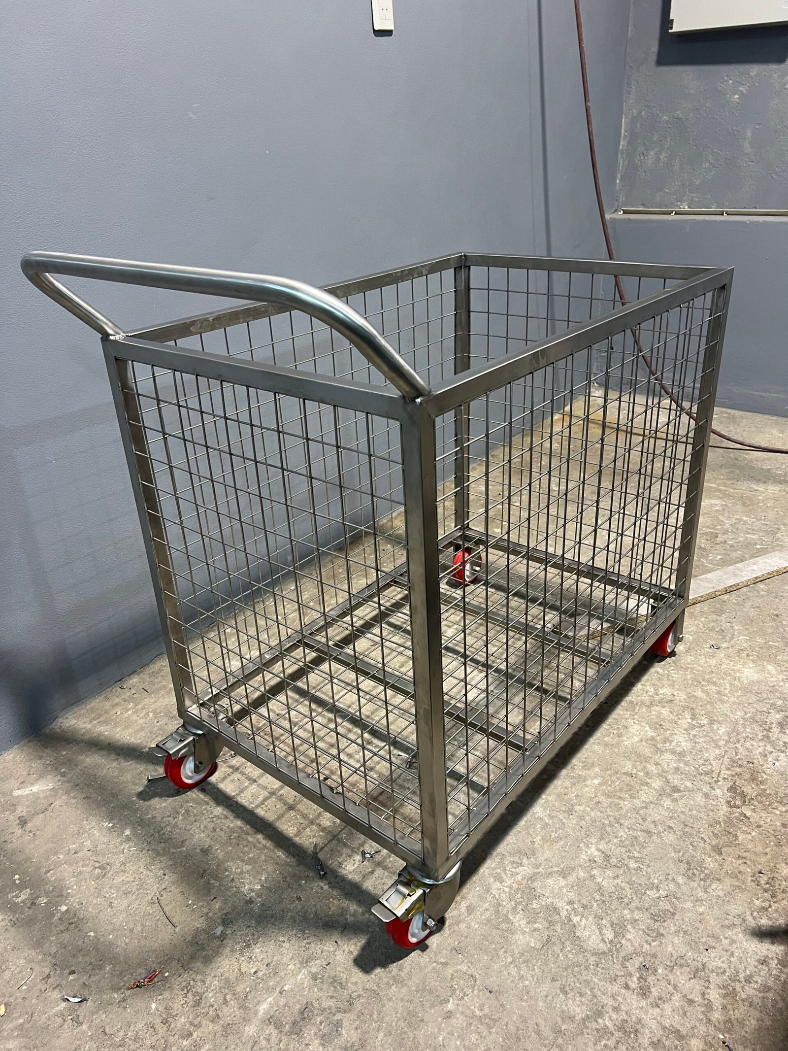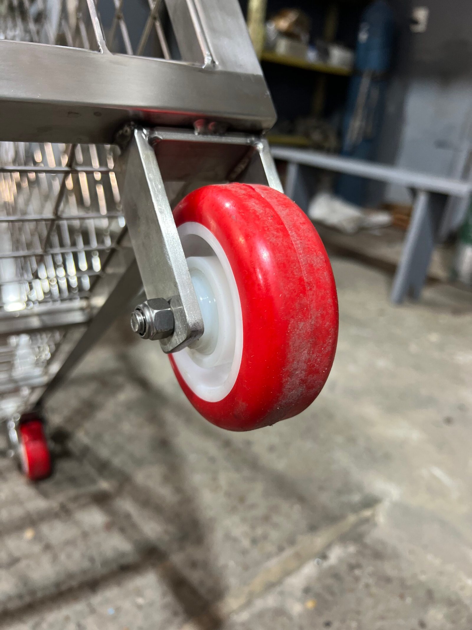 Carro de servicio industrial en acero inoxidable para transportar baldes de helado. Fabricado a medida para Helados Cremolatti.