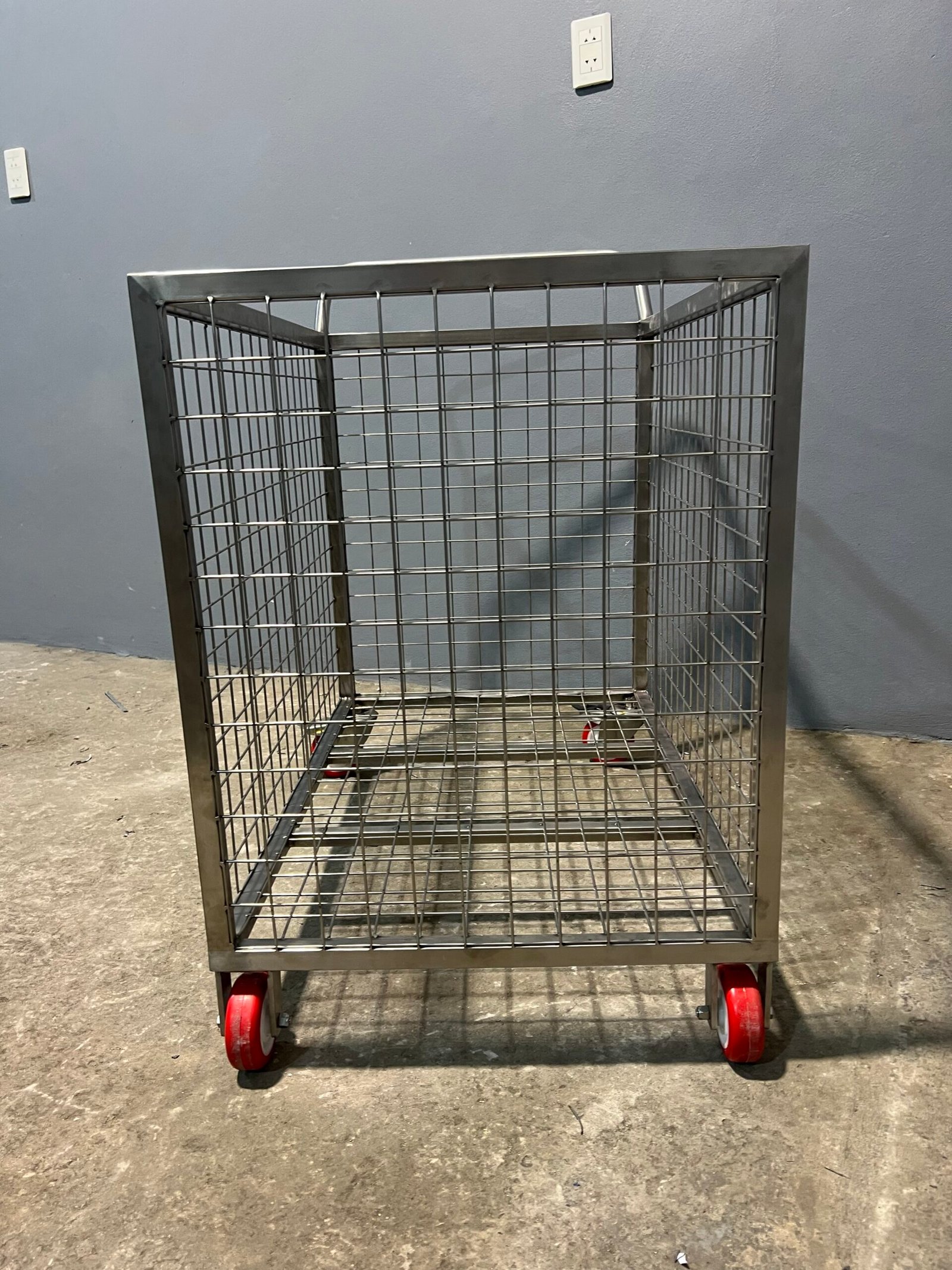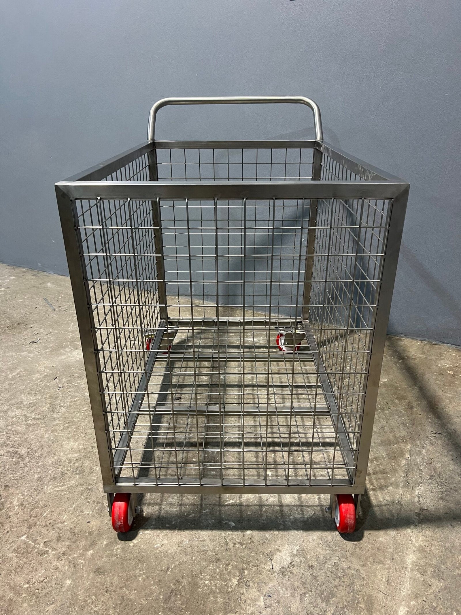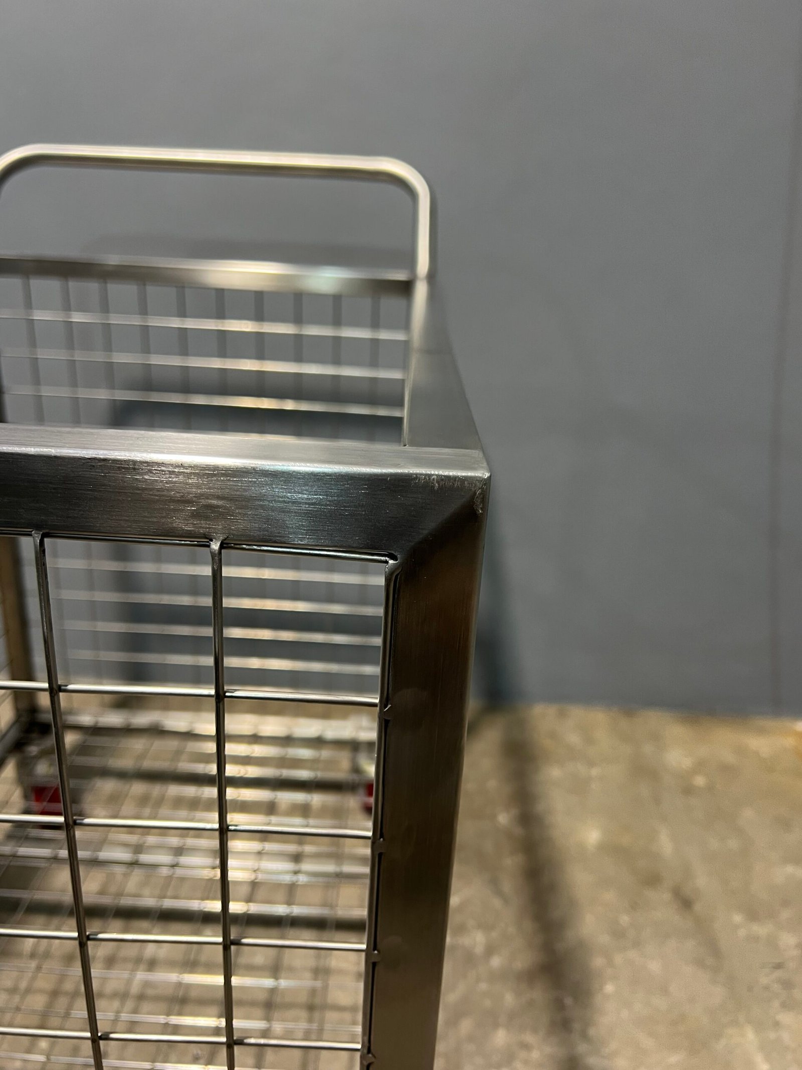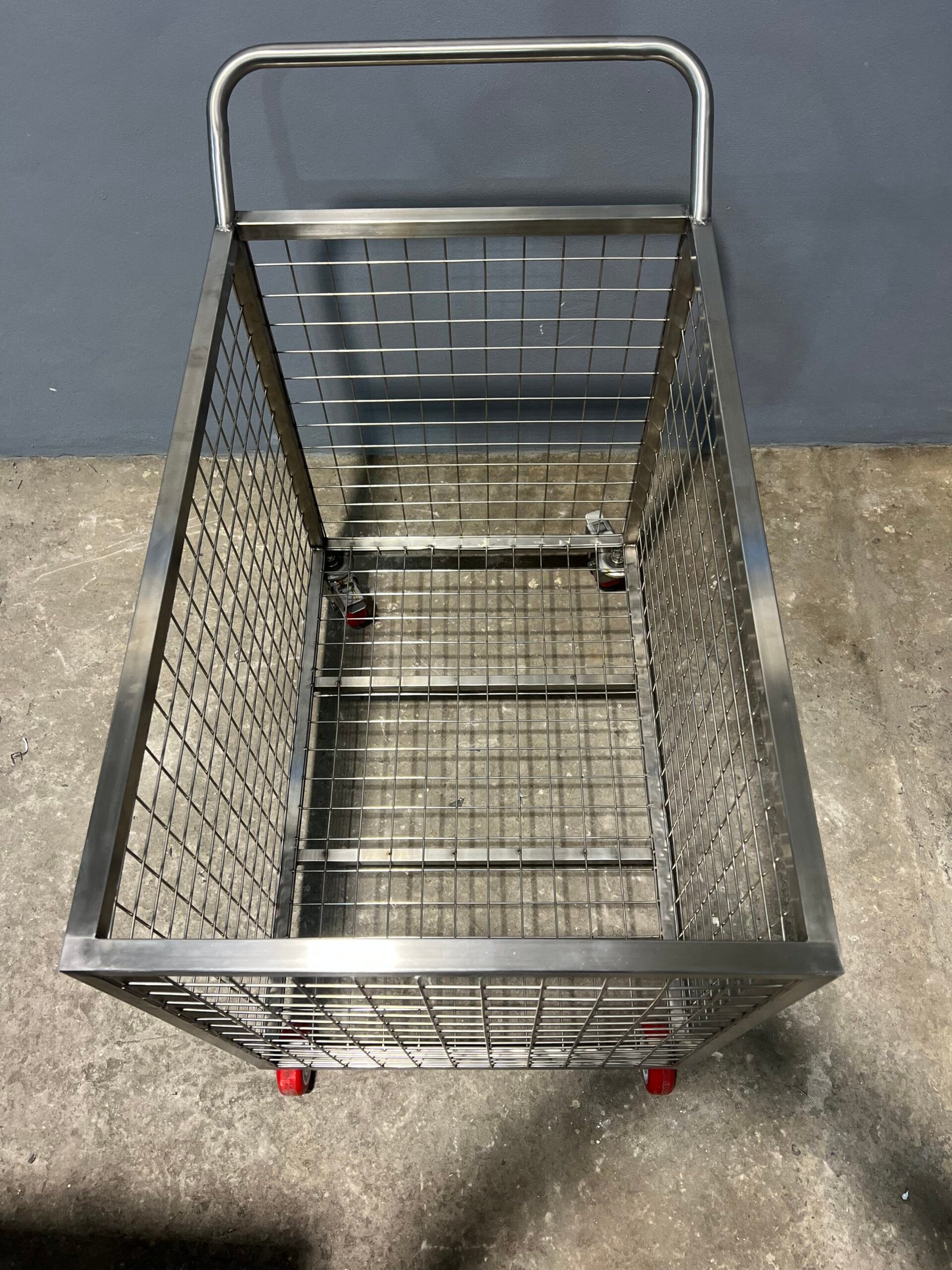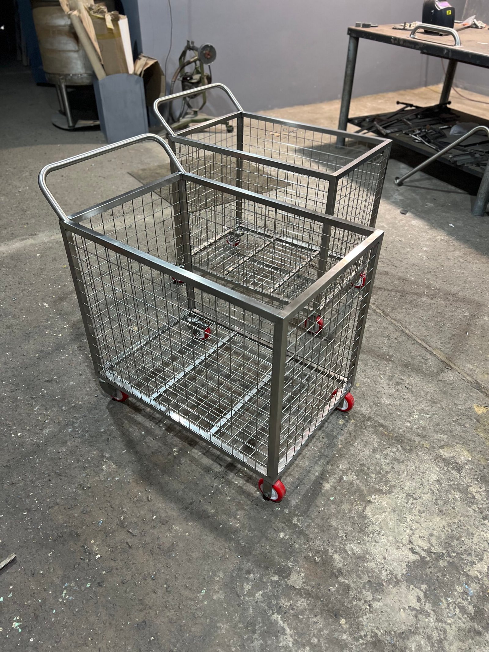 Carro de servicio industrial en acero inoxidable para transportar baldes de helado. Fabricado a medida para Helados Cremolatti.