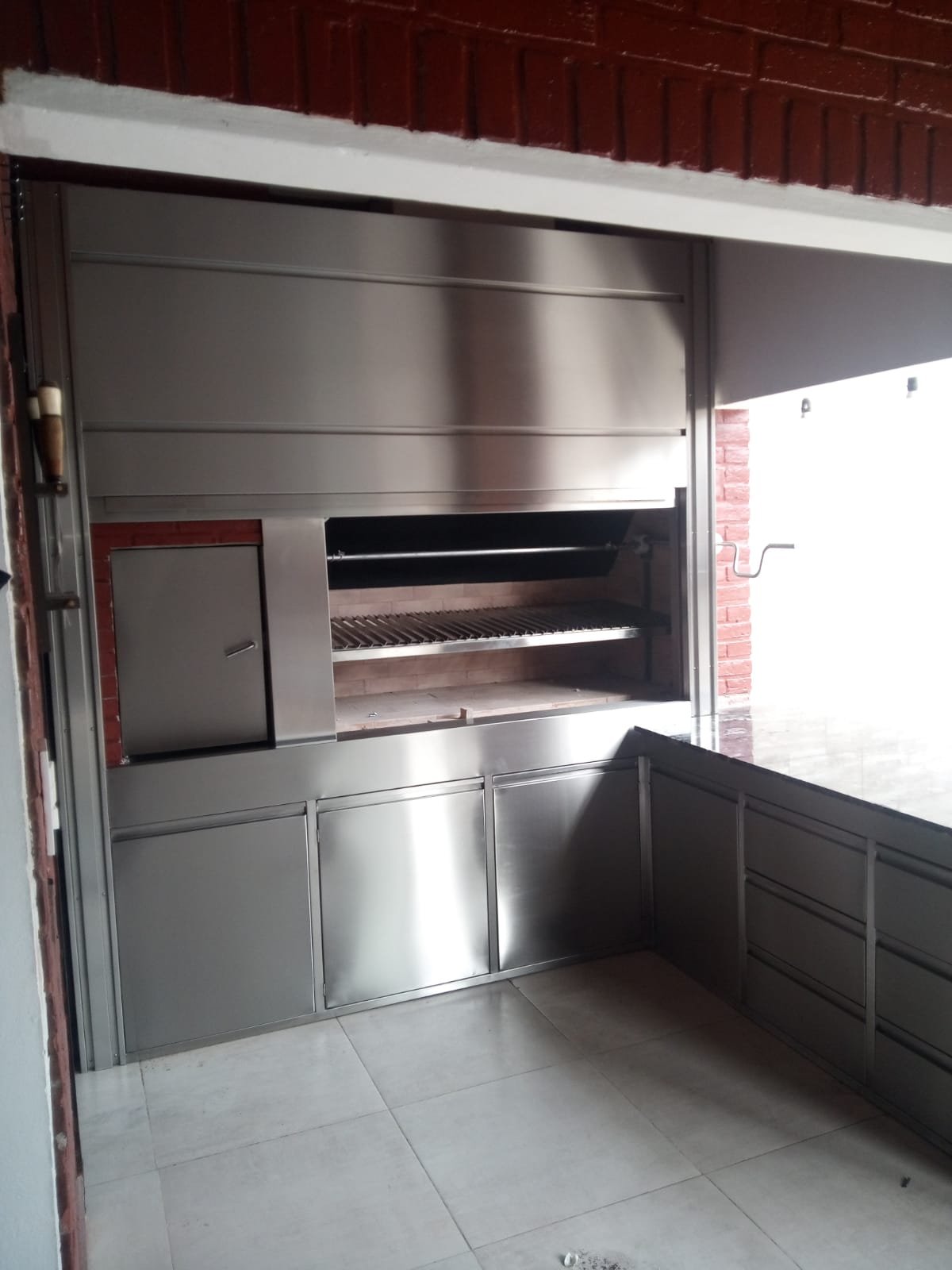 Fabricación y colocación en obra de frente de parrilla en acero inoxidable moderno con cajonera, fogonero y emparrillado. Además se fabrico y coloco un tapa a juego para cerrar el ambiente. Puerta con abertura tipo guillotina con sistema de contrapesos. Todo a medida y pedido de nuestro cliente.