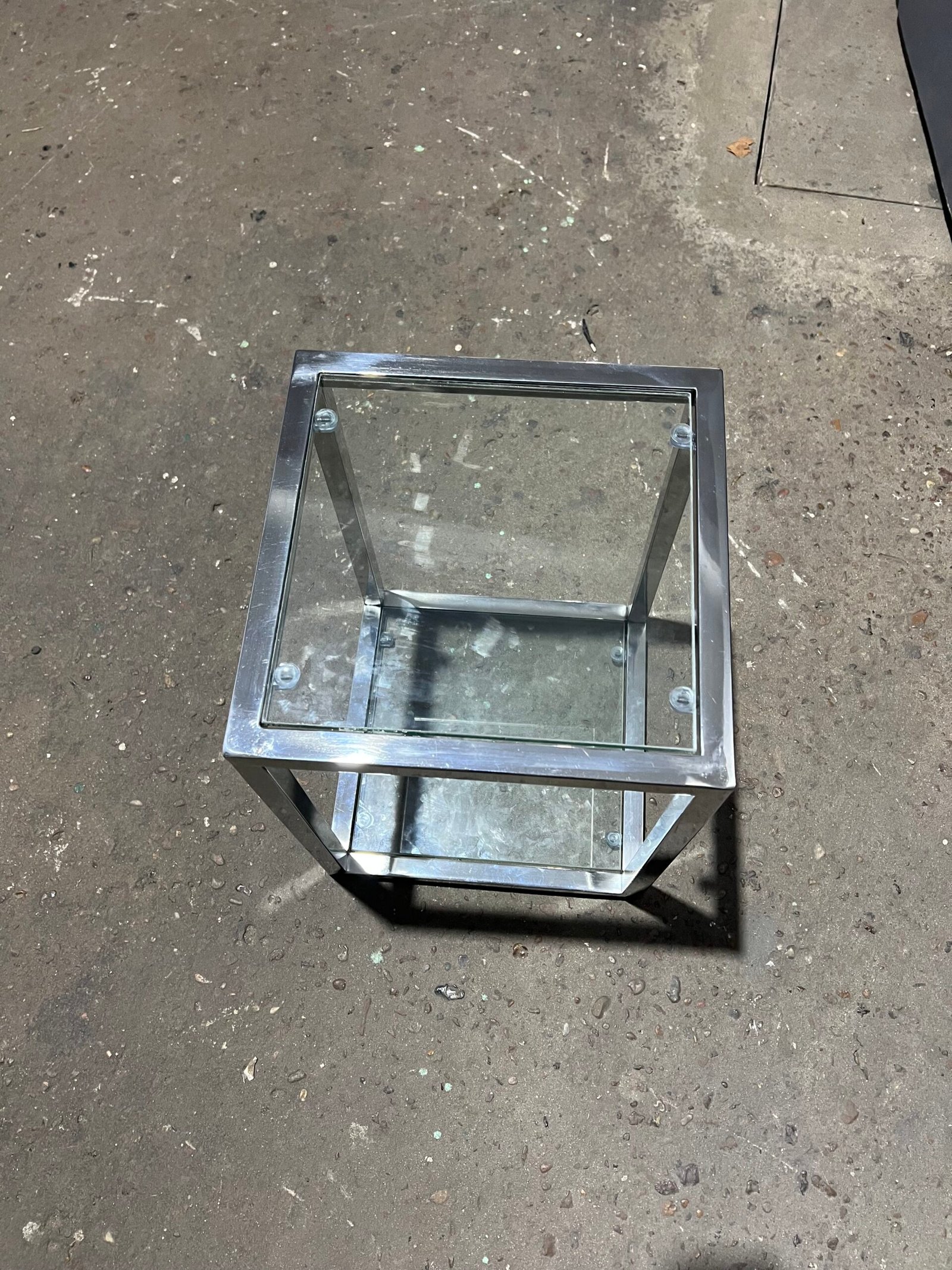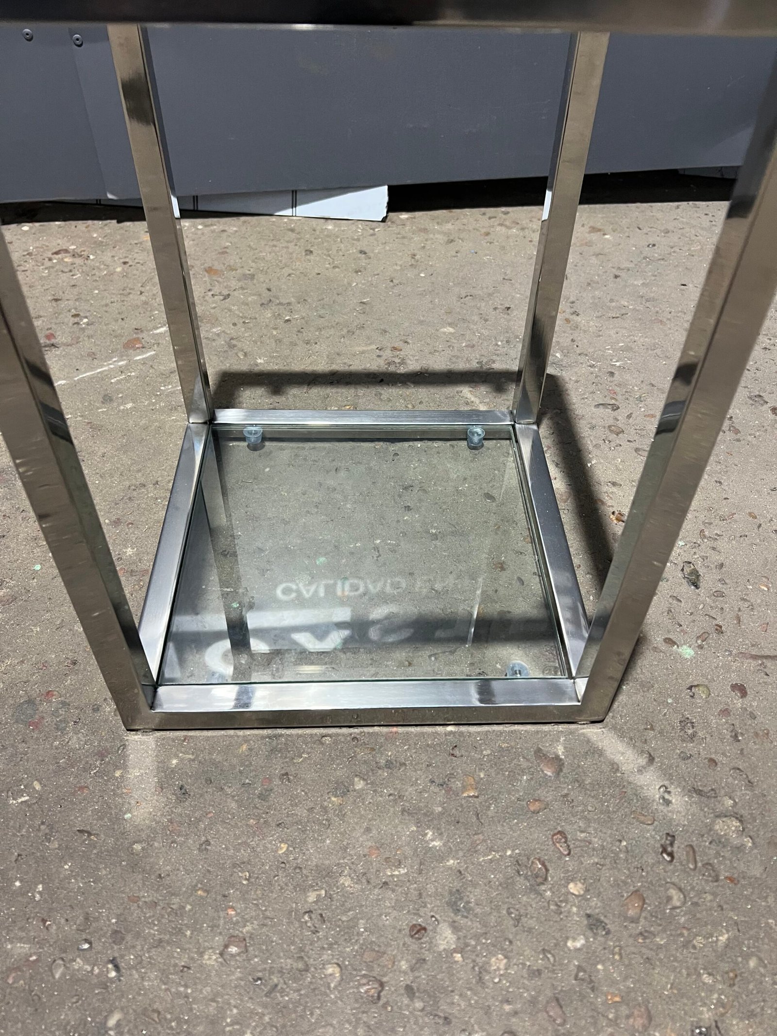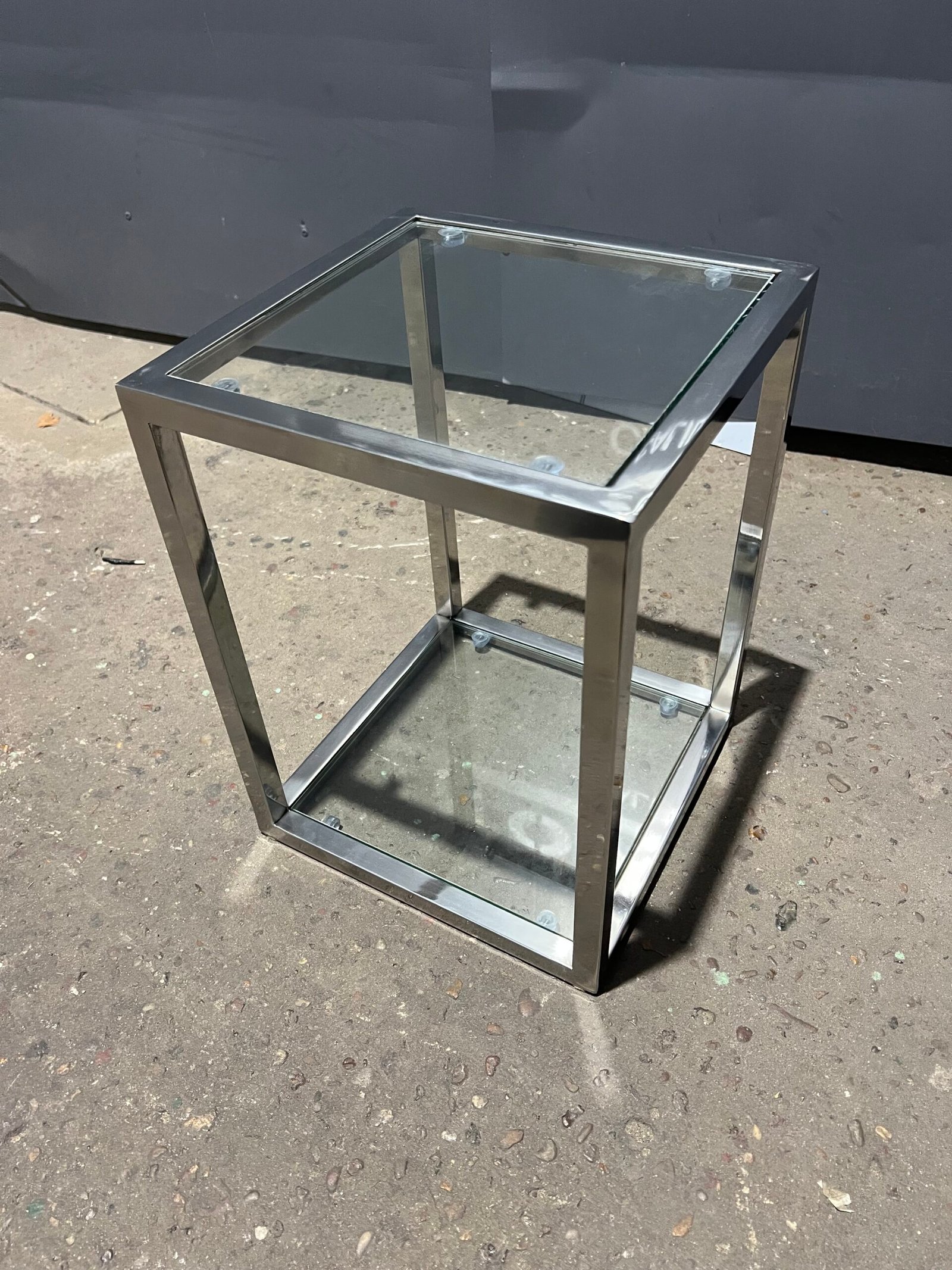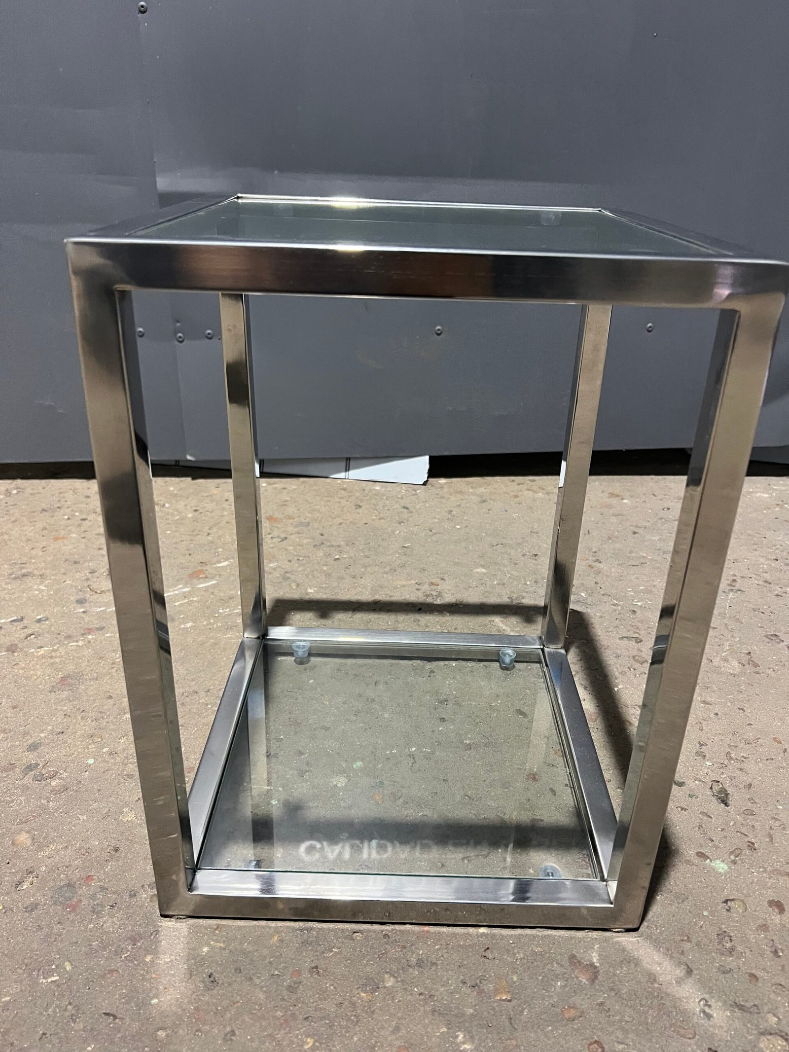 Juego de mesas decorativas en acero inoxidable pulido espejo. Estantes de vidrio.