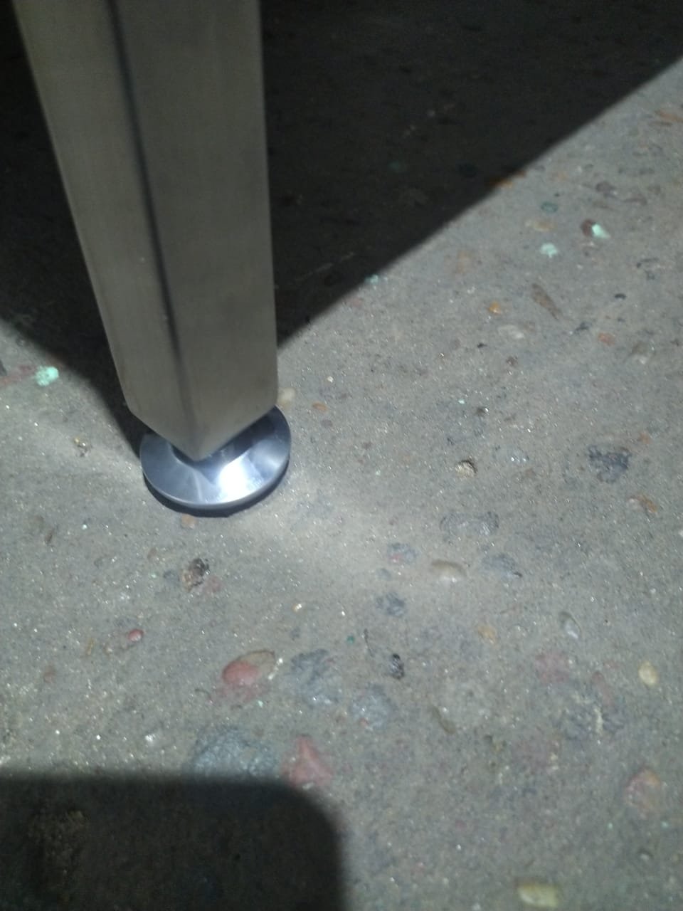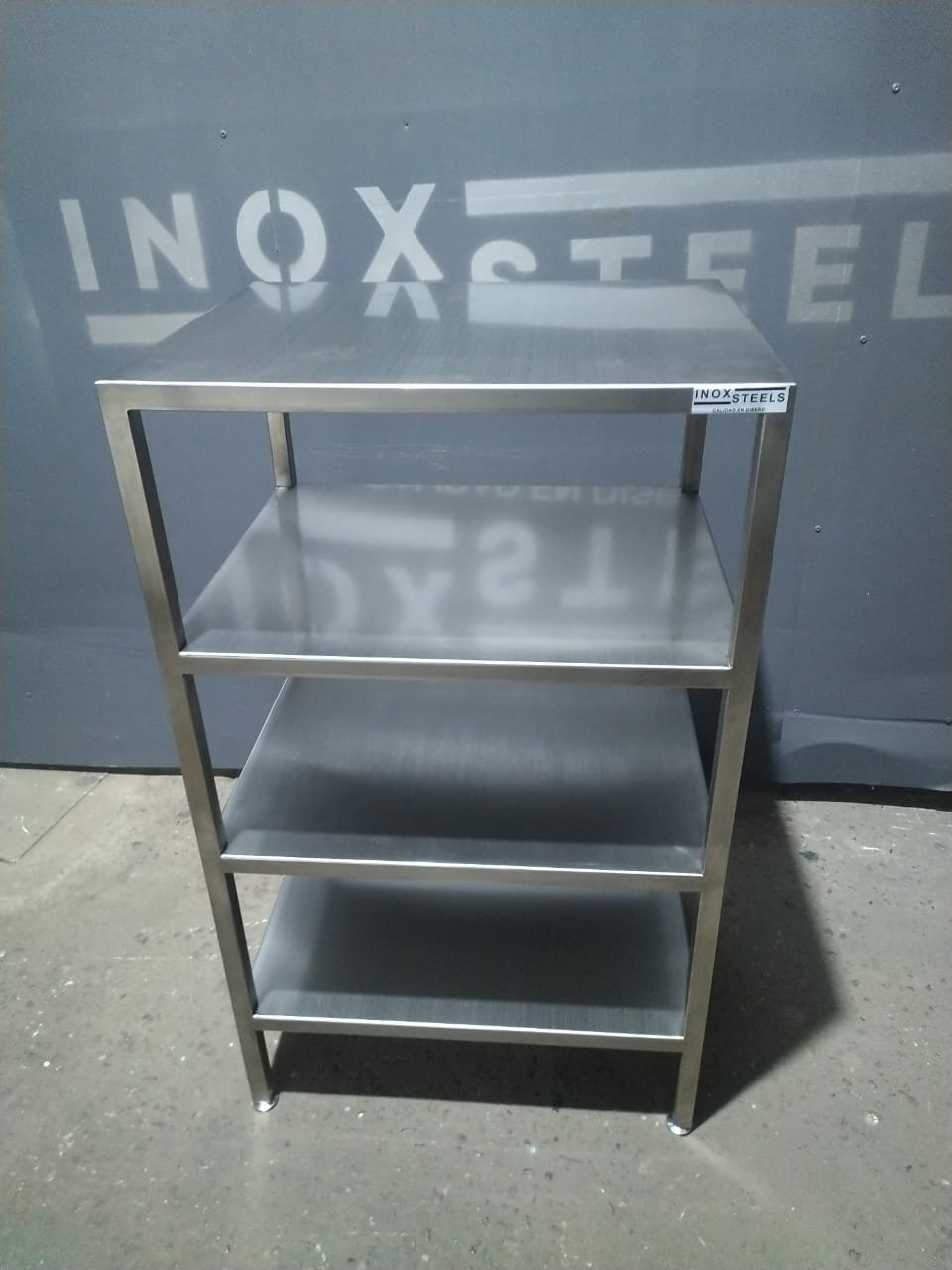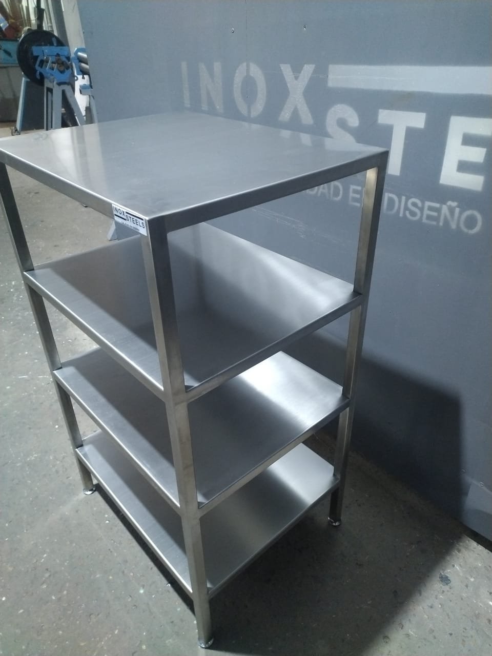 Mesa de 4 niveles en acero inoxidable con topes regulables. Fabricada y diseñada a medida para Helados Cremolatti. Ideal uso alimenticio