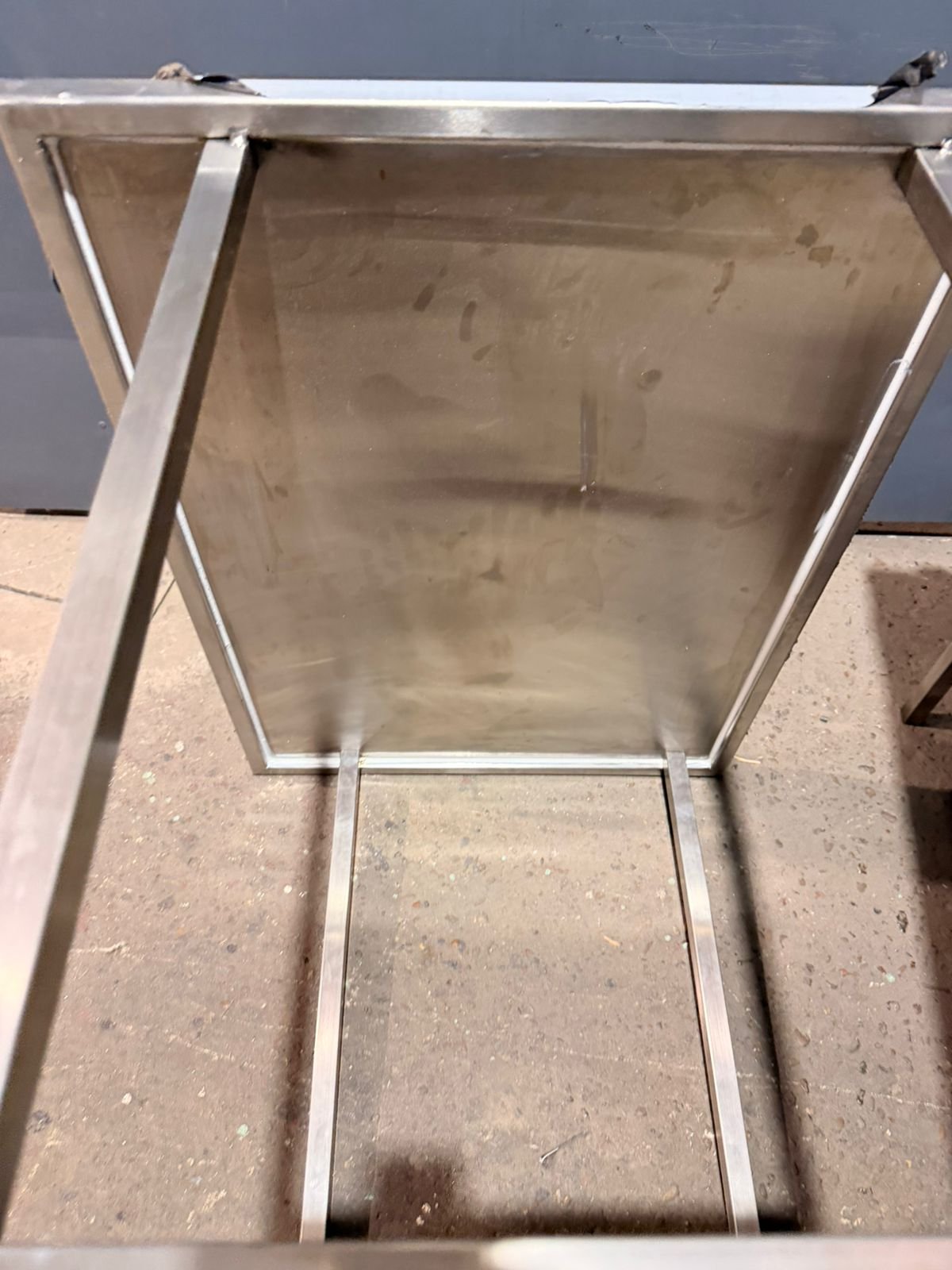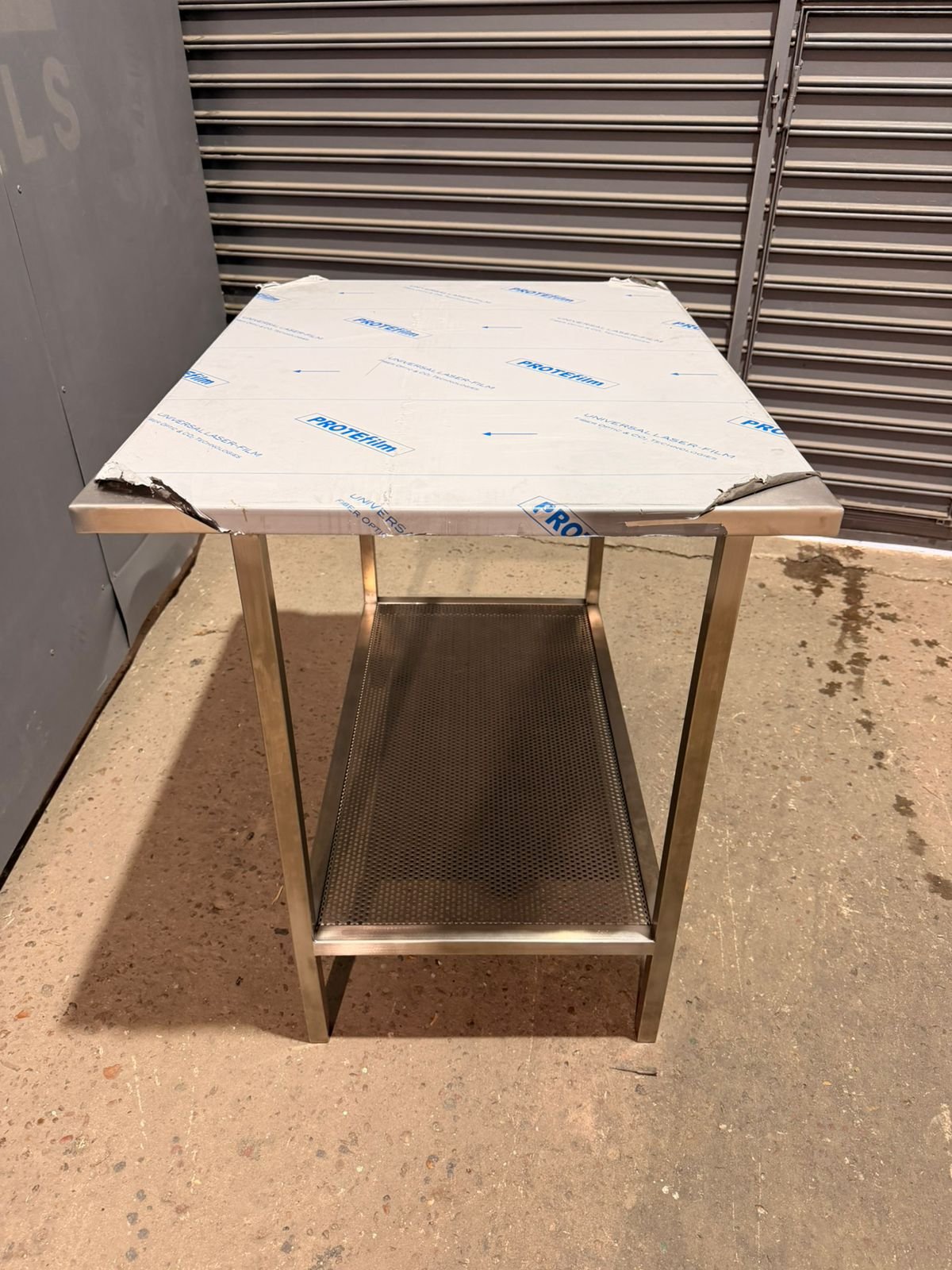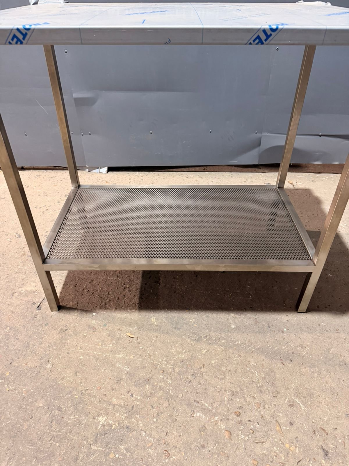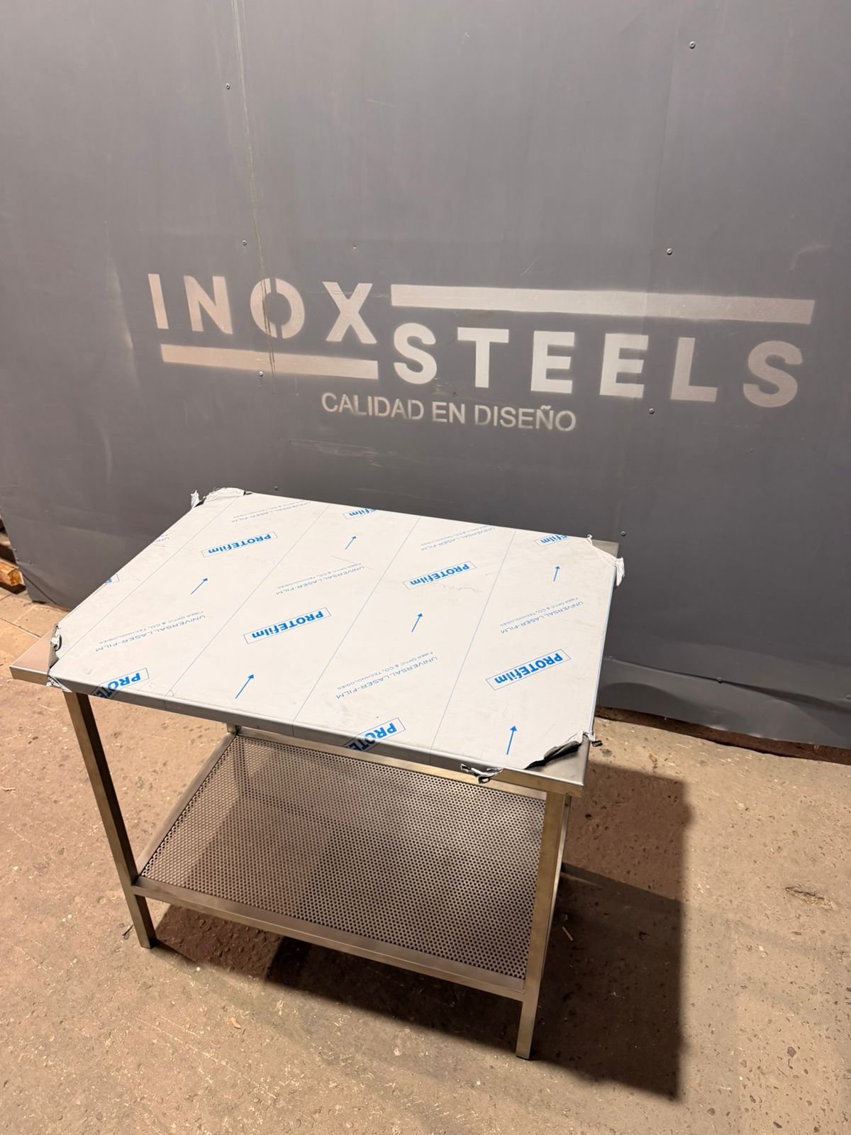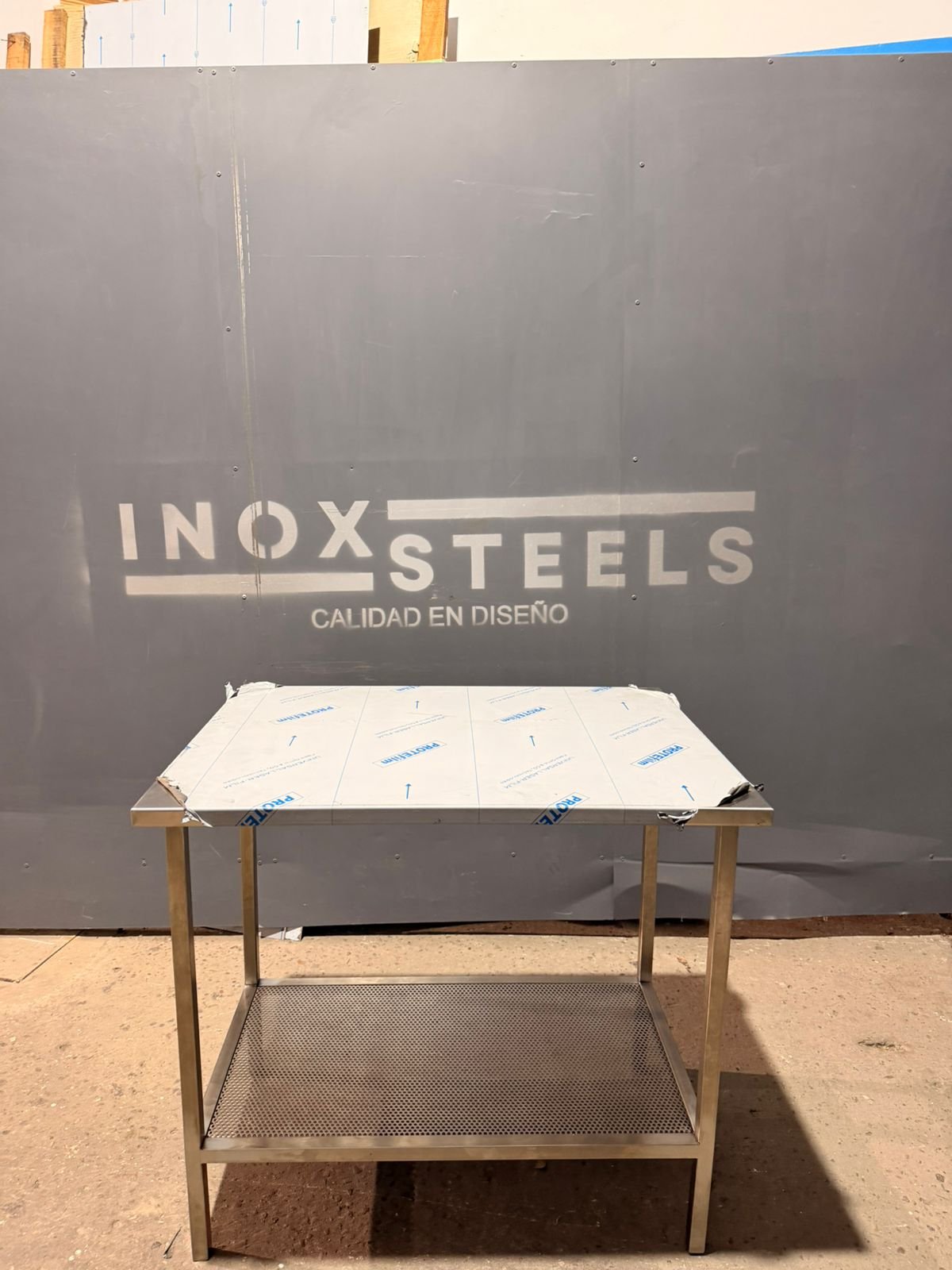 Mesas de servicio industriales con un estante microperforado para alimentos. Fabricadas a medida para Helados Cremolatti.
