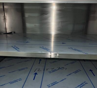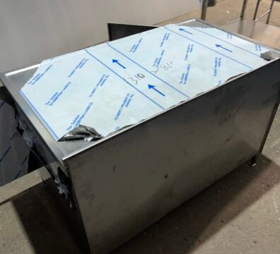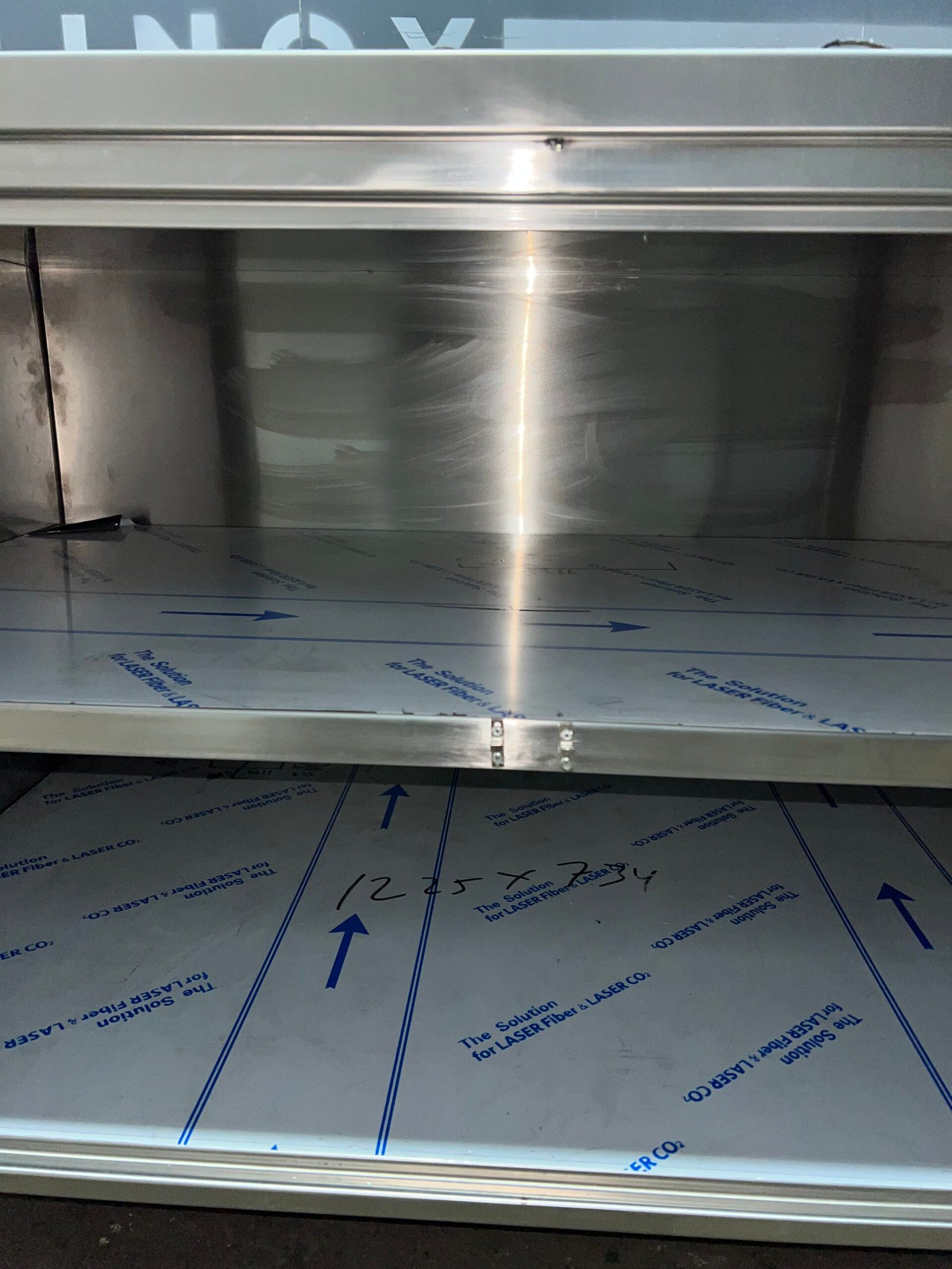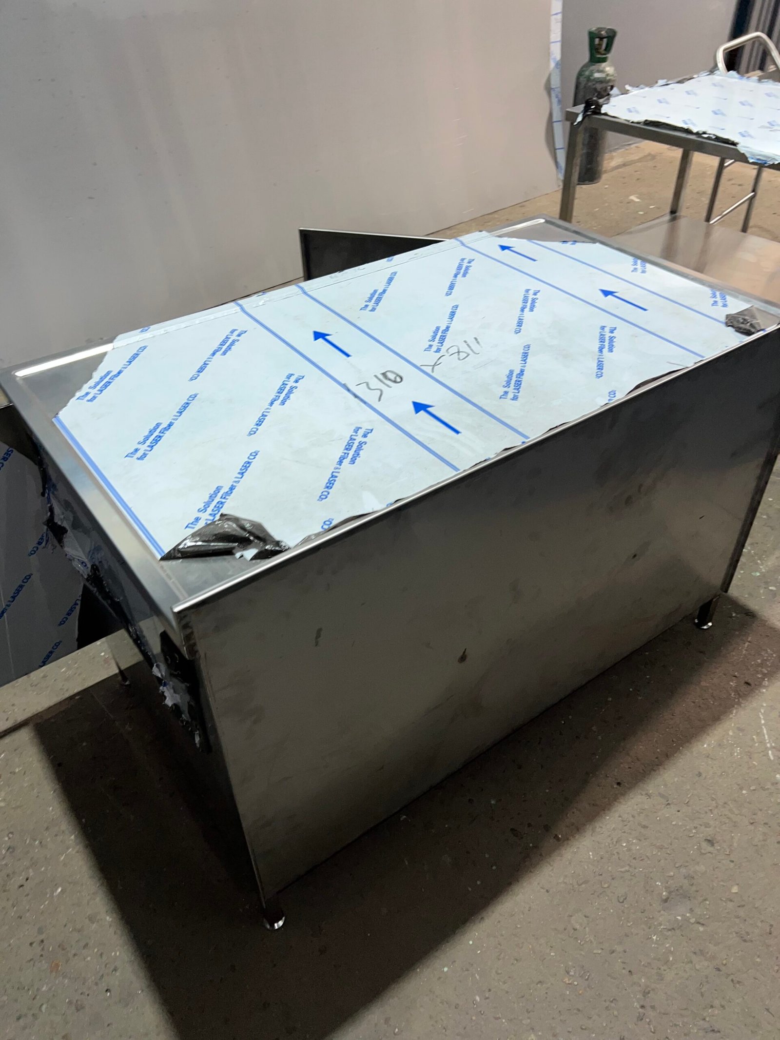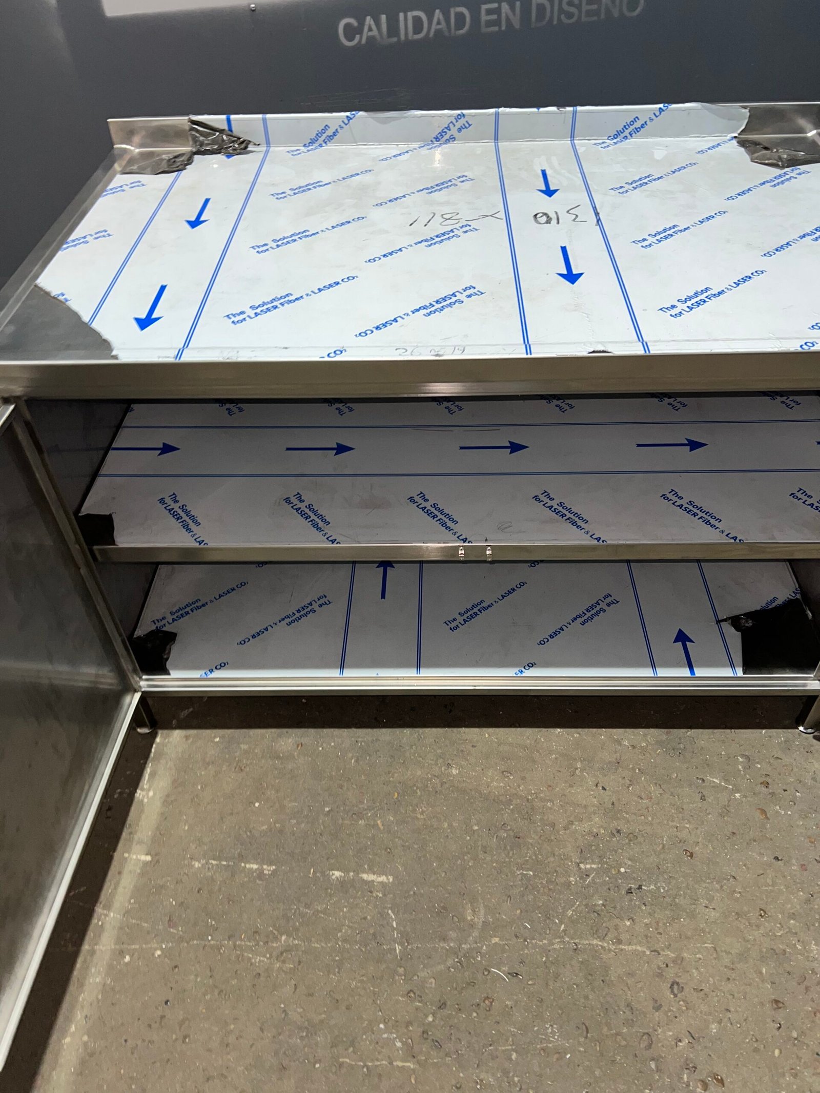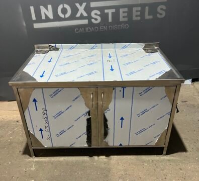 Fabricación de mueble en acero inoxidable con un estante y puertas. Mesada con anti-desborde. Super resistente. Con topes regulables Fabricado a medida para laboratorios Raffo.