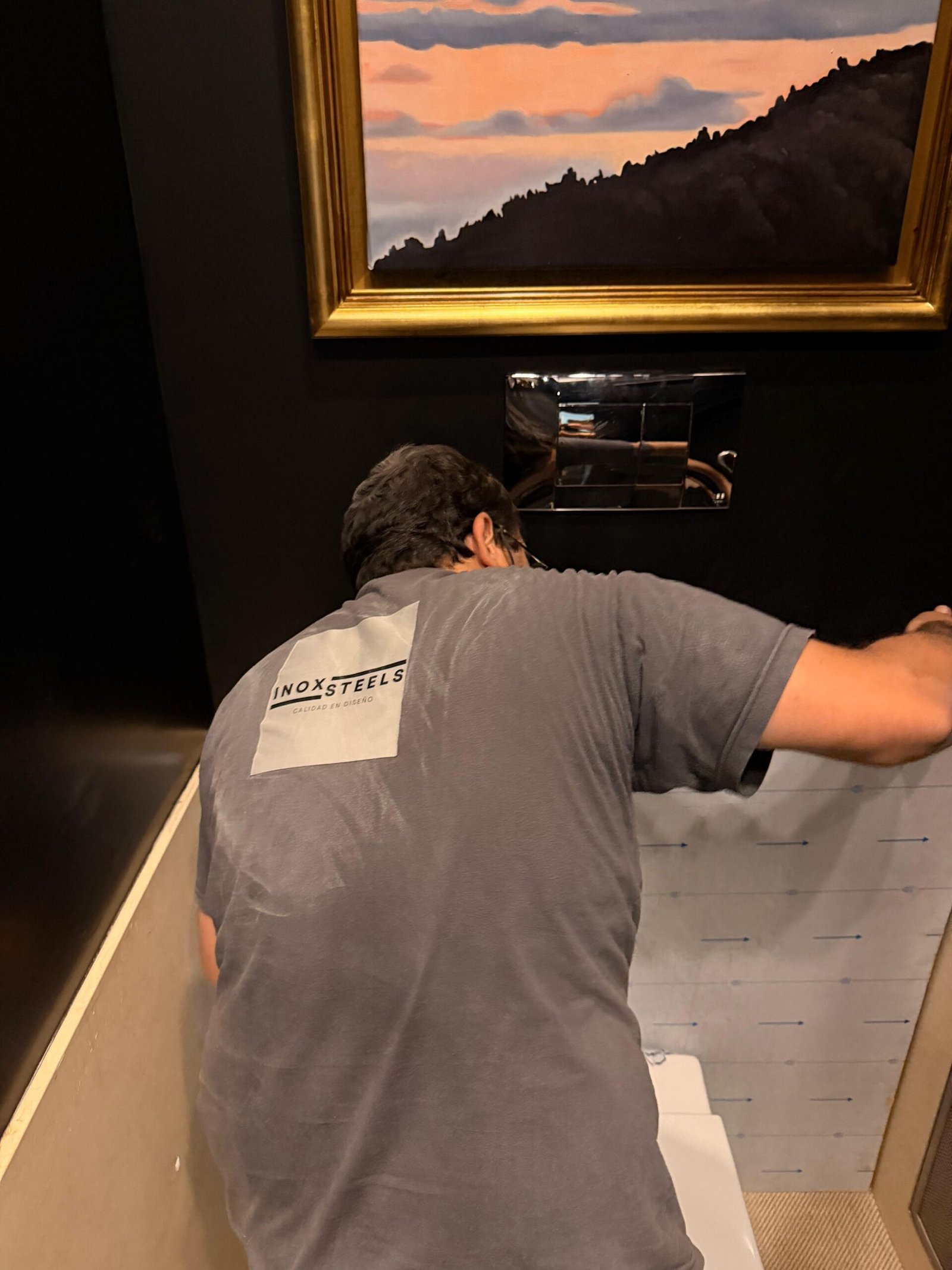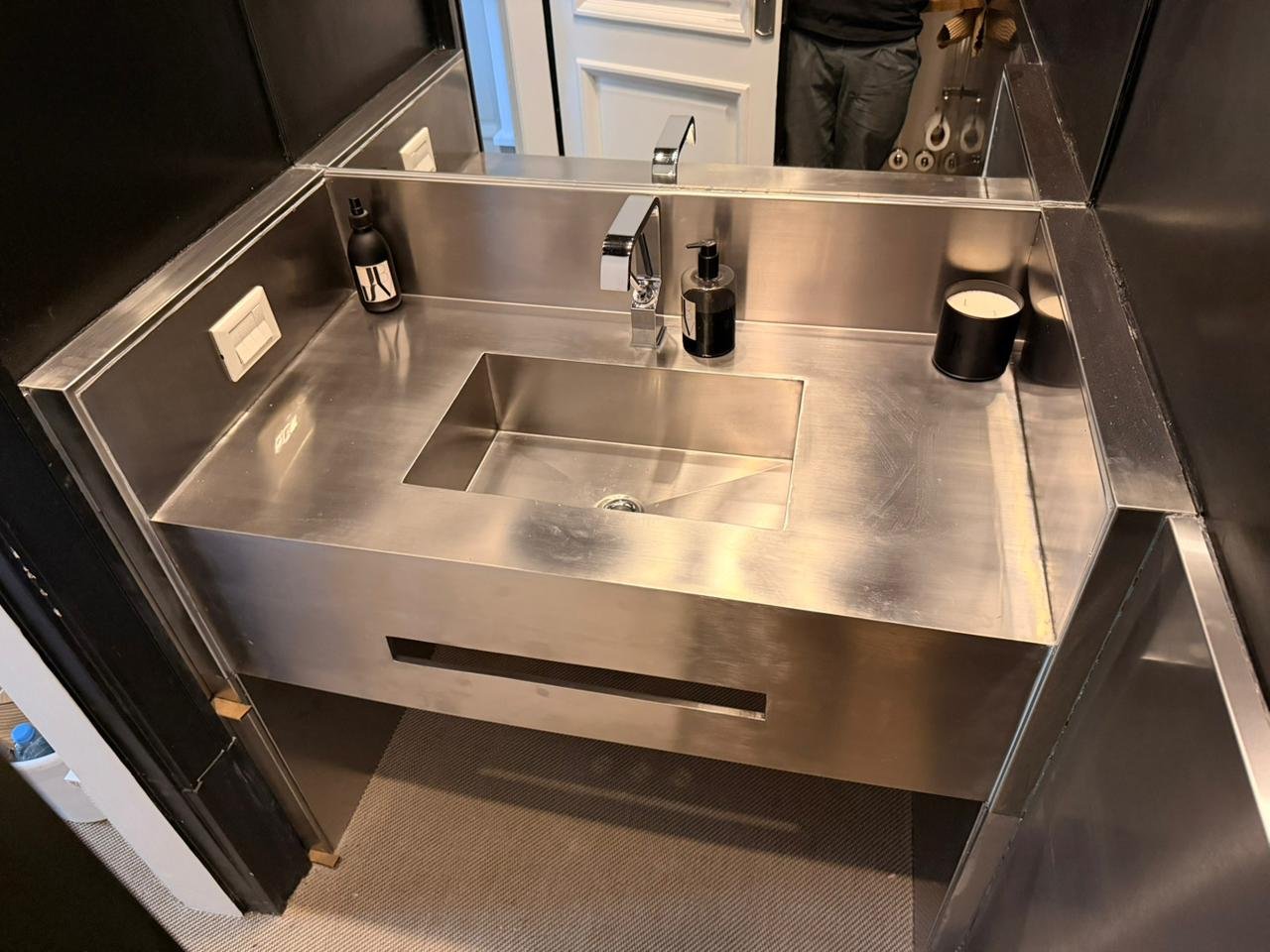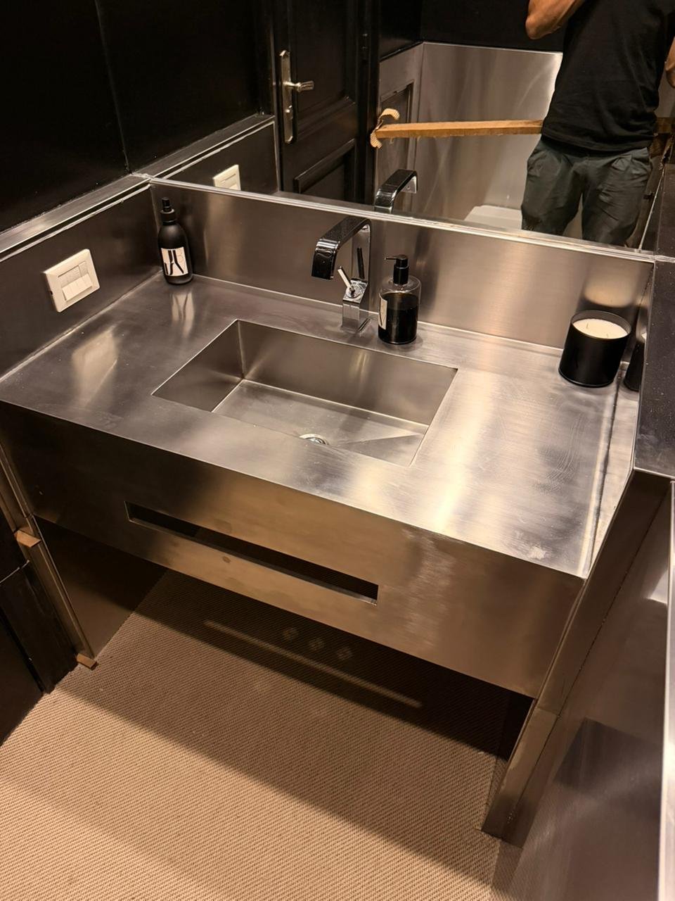Bacha y revestimiento para Toilette todo en acero inoxidable. Se realizo la fabricacion en taller y luego la colocación en obra.