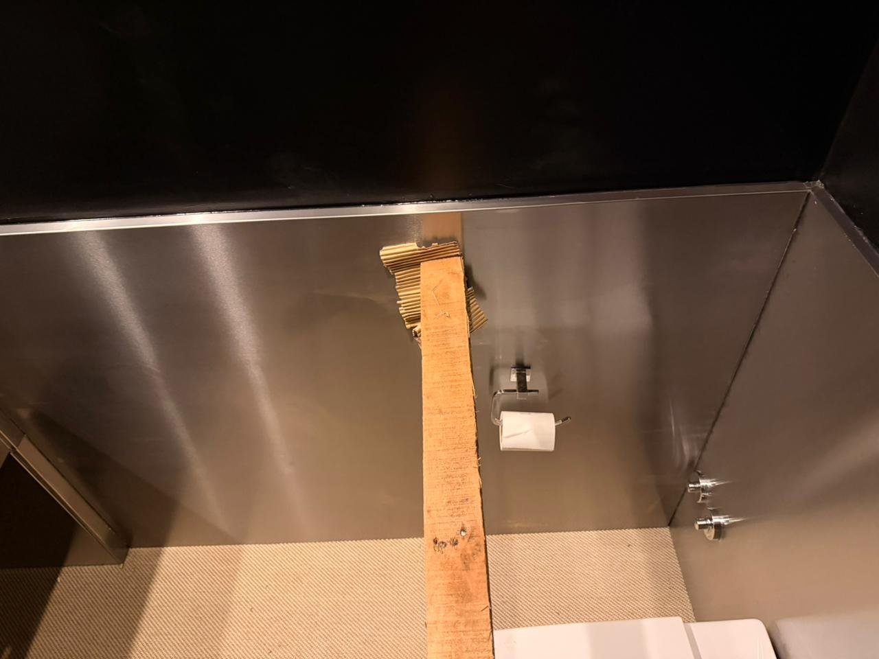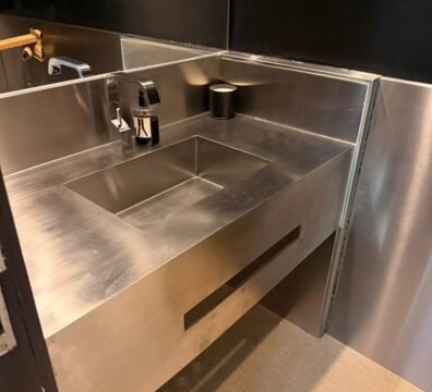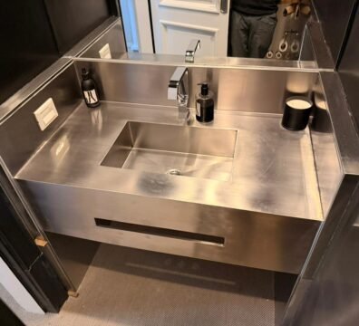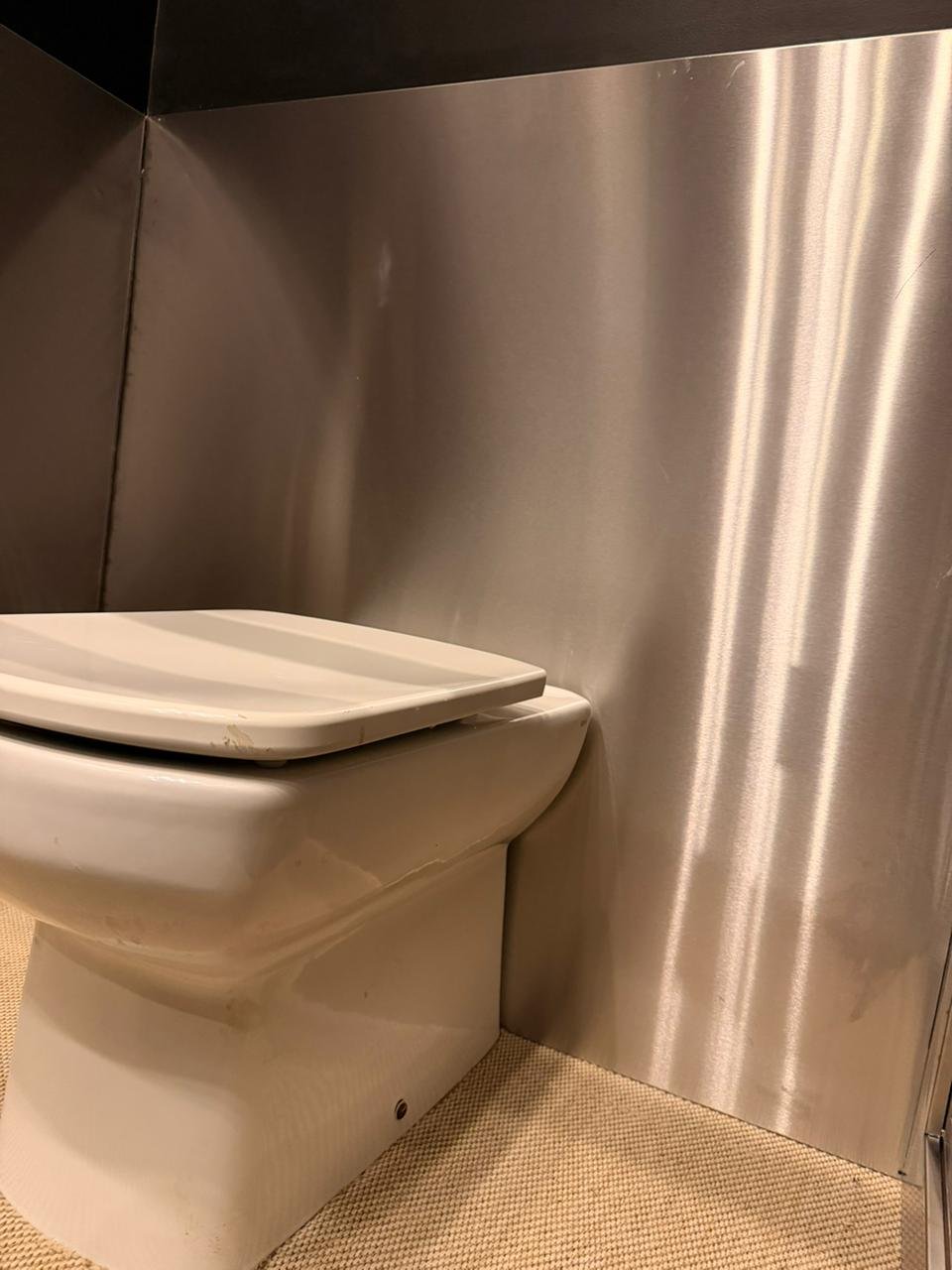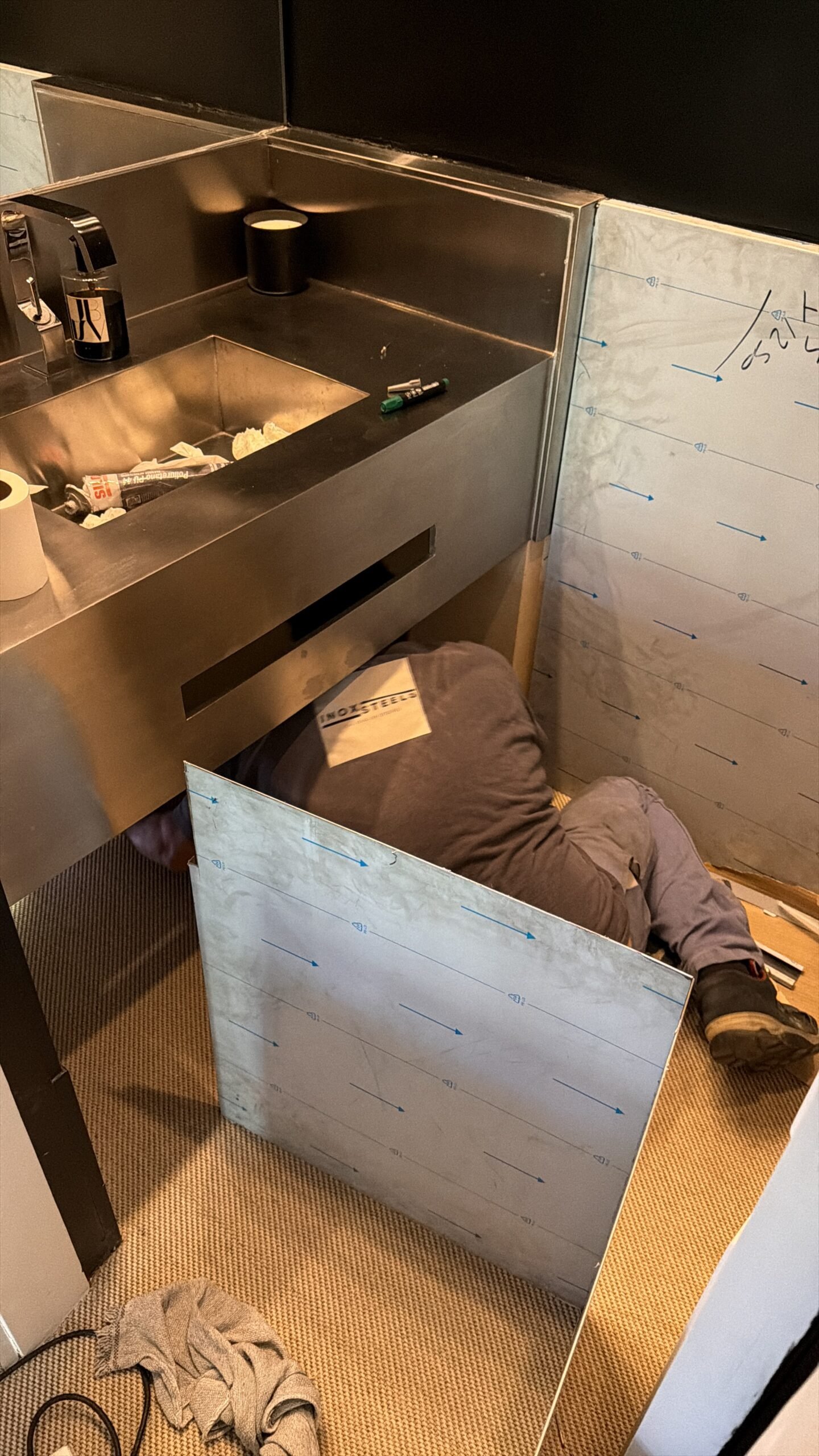 Bacha y revestimiento para Toilette todo en acero inoxidable. Se realizo la fabricacion en taller y luego la colocación en obra.